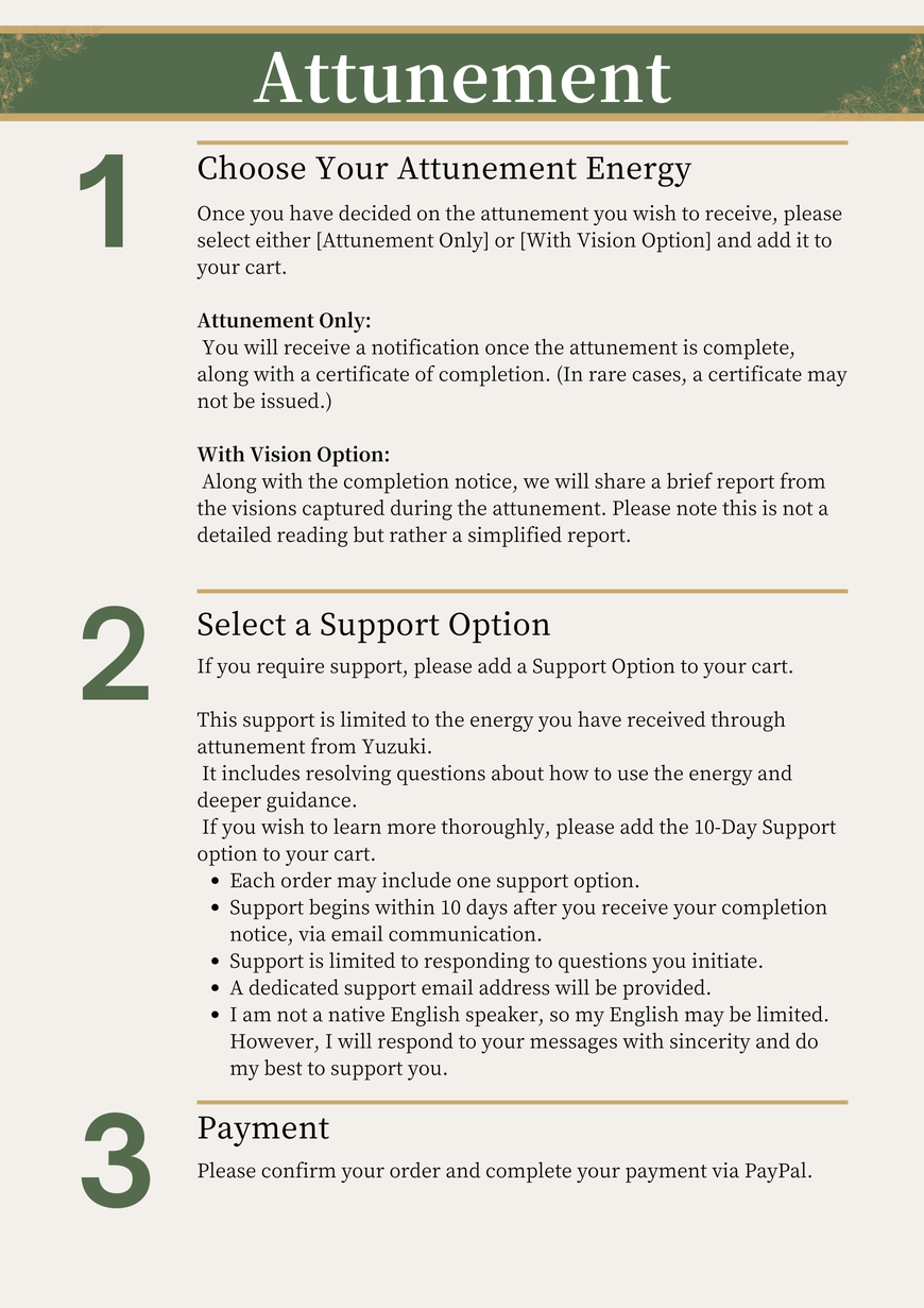 In order to ensure a precise and stable attunement, I include both preparations and post-processes, and spend about 60–90 minutes on each attunement.